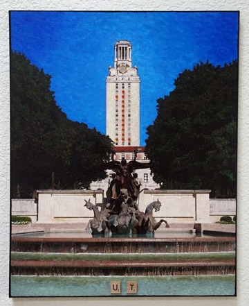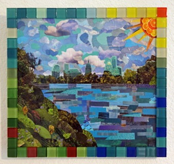 "Mosaic View from Barton Springs" - Mixed media (paper collage and glass tiles) on wood (14.5" x 15.5")