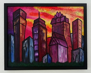 Acrylic painting and mixed media pieces exploring cityscapes and architecture