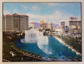 "Fountain View Las Vegas" - Mixed media (digitally edited original photography, acrylic paints on top of photo, embroidery accents) on canvas (12" x 16" x 5/8")