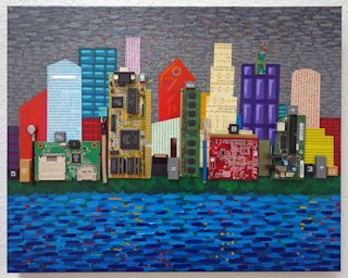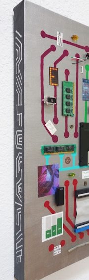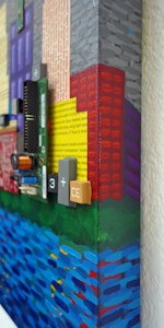 "Smart City" - Mixed media (acrylics, computer parts, paper, found objects) on canvas (16" x 20" x 1.5") + edge view