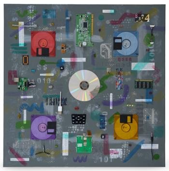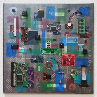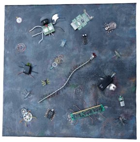 "Computer Bugs" - Mixed media (acrylics, computer parts, found objects) on canvas (14" x 14" x 5/8")