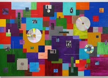 "The Cloud" - Mixed media (acrylics, computer parts, paper, found objects) on canvas (14" x 14" x 5/8")