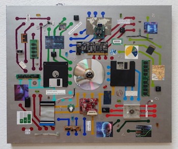 Mixed media pieces incorporating old computer and electronic parts and other found objects