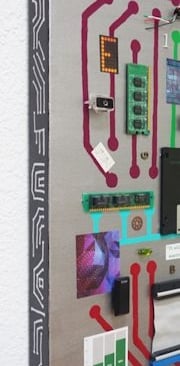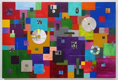 "Pixelated" - Mixed media (acrylics, paper, computer parts, wire) on canvas (24" x 36" x 1.5")